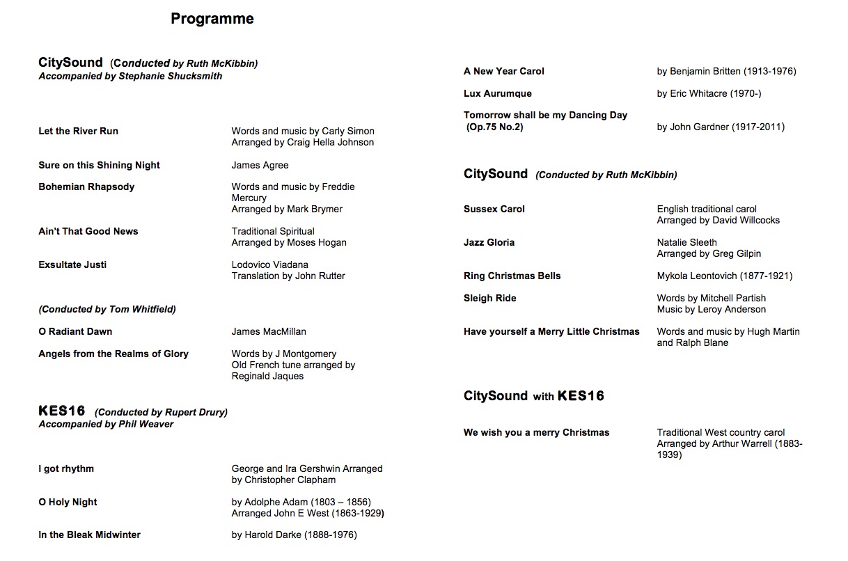 KES 16 is King Edward’s School’s auditioned chamber choir and we are very honoured to have been asked to support this special concert tonight to launch a new choir in Bath, CitySound. KES 16 was formed by Rupert Drury in 2007 in order to stretch the top vocalists in the school and to train them in the art of choral singing in a wide variety of styles but with a particular focus on challenging contemporary pieces and extended vocal harmonies and techniques. The name KES 16, does allude to the world famous vocal group led by Harry Christopher’s, but the number of singers is very much more to do with creating a good balance between the parts. In our experience there is usually one vocal absence at performances due to illness so we actually run with one in reserve at 17, so if you lucky enough to have all of them tonight, the flu jabs must be working! The group is re-auditioned every September.