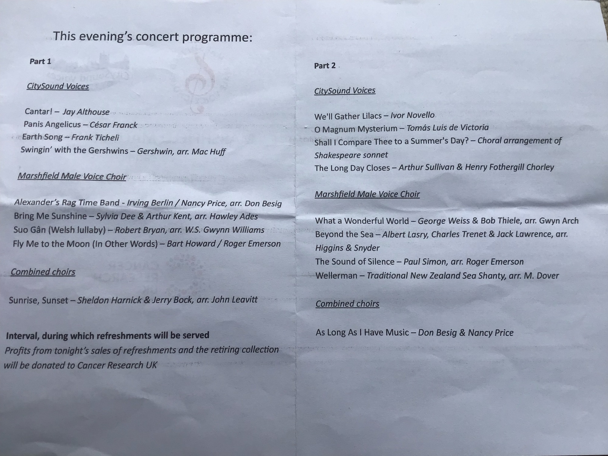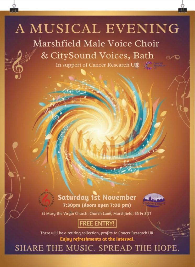 Marshfield, November 2025 Concert programme featuring the CitySound Voices and Marshfield Male Voice Choir. Share this: Click to share on X (Opens in new window) X Click to share on Facebook (Opens in new window) Facebook Like Loading...